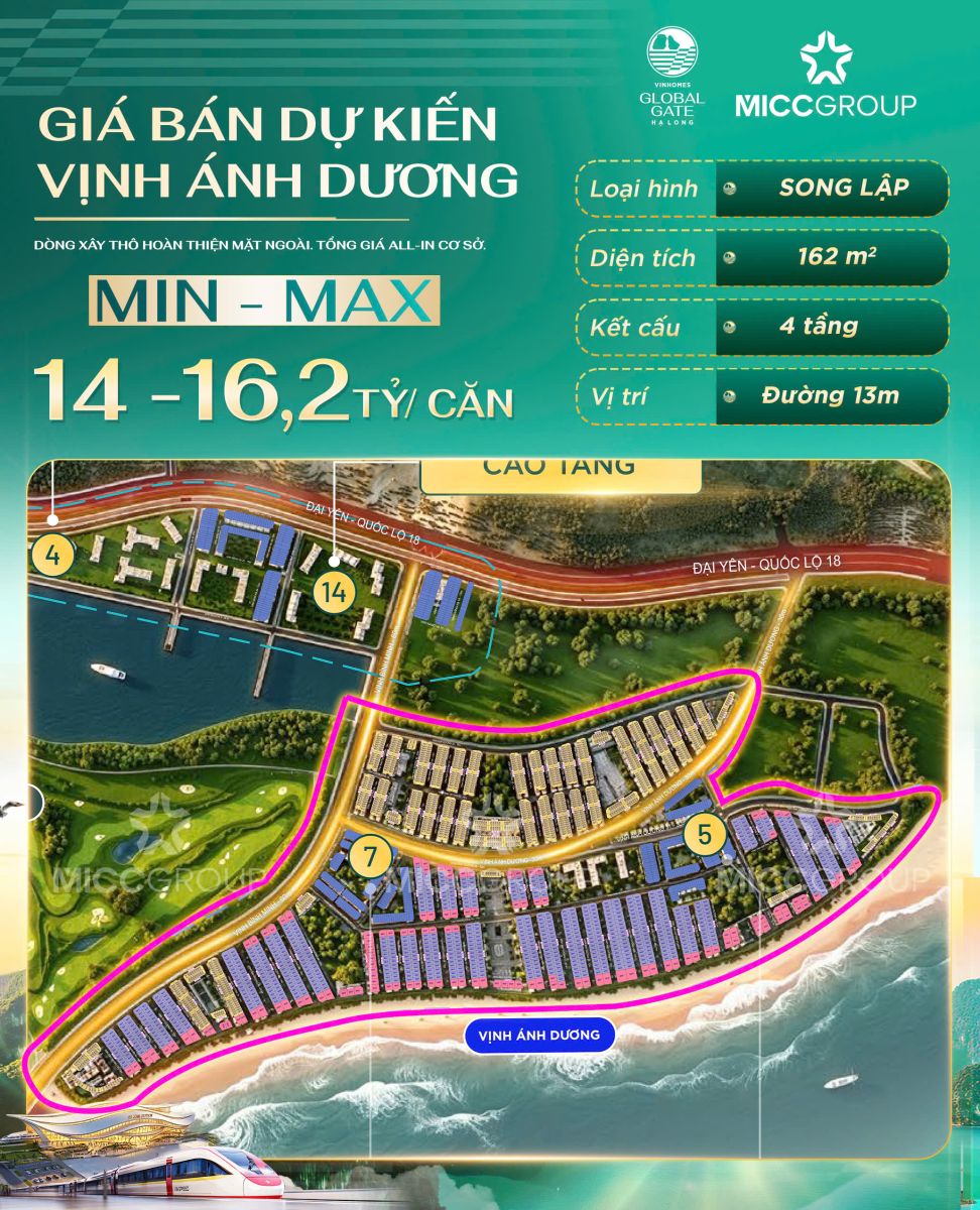 Vịnh Ánh Dương - SONG LẬP XÂY THÔ (Diện Tích 162m2 - 210m2) - Phân Khu Châu Mỹ- Vinhomes Hạ Long Xanh (Vinhomes Global Gate Hạ Long)